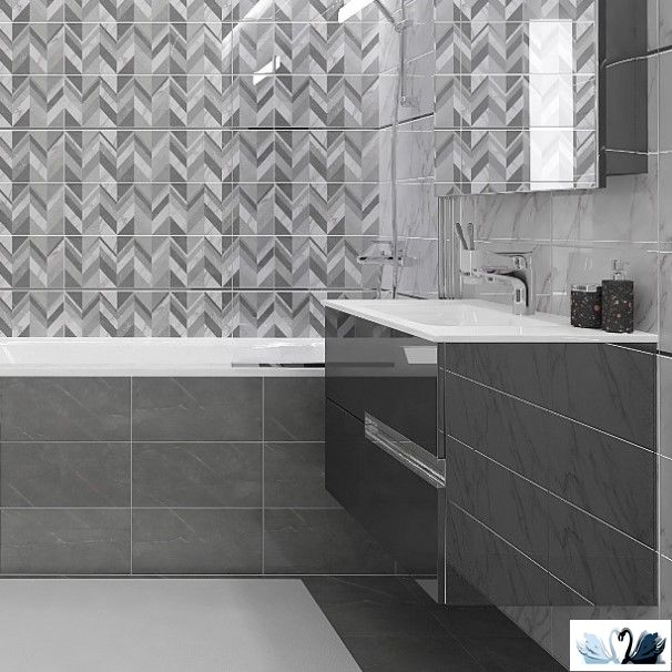 В серию одного цвета входит настенная фоновая плитка светлого оттенка, а также два варианта декофона с геометрическим декором - узор двух цветовых решений - бежевый и серый.