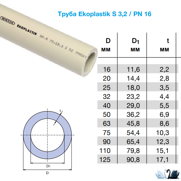 PPR S 3,2 / SDR 7,4 / (PN 16) - Полипропиленовые трубы от фирмы Экопластик для холодной и горячей питьевой и технической воды различного назначения, а также напольного отопления. У труб данного напорного ряда (c разной толщиной стенки) следующие типоразмеры (приводится наружный диаметр): 16, 20, 25, 32, 40, 50, 63, 75, 90, 110 и 125 мм.