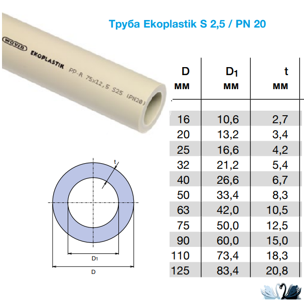 PPR S 2,5 / SDR 6 / (PN 20) - Полипропиленовые трубы от фирмы Экопластик для холодной и горячей воды различного назначения повышенного давления, а также а также для низкотемпературного отопления. У труб данного напорного ряда (c разной толщиной стенки) следующие типоразмеры (приводится наружный диаметр): 16, 20, 25, 32, 40, 50, 63, 75, 90, 110 и 125 мм.