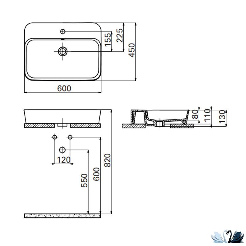 Особенности - Без отверстия для смесителя, ультра тонкая толщина бортика всего лишь 5 мм, форма раковины и чаши прямоугольные с четкими углами, ровная поверхность без "целлюлита".