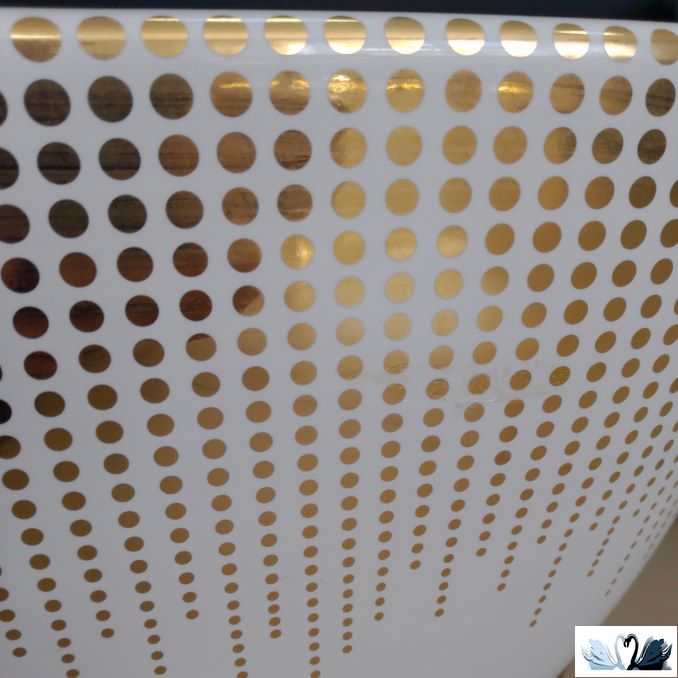Декор унитаза "Золото Круги" выполнен золотыми кружками по всему внешнему переднему краю унитаза. Золотые точки различных размеров от большего к меньшему.